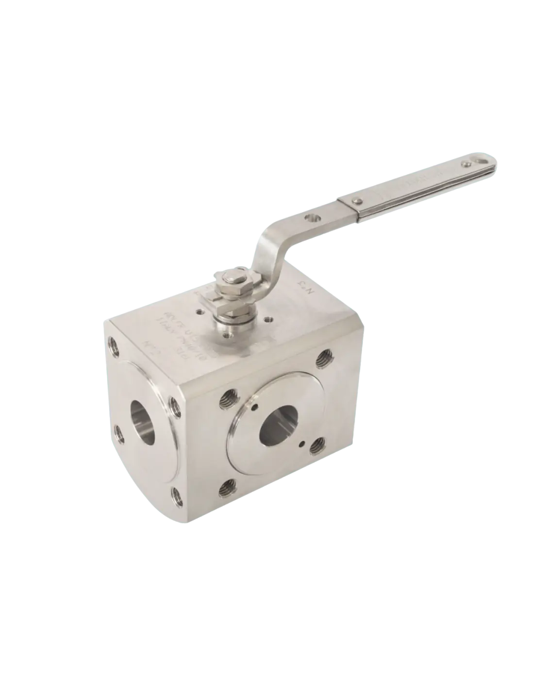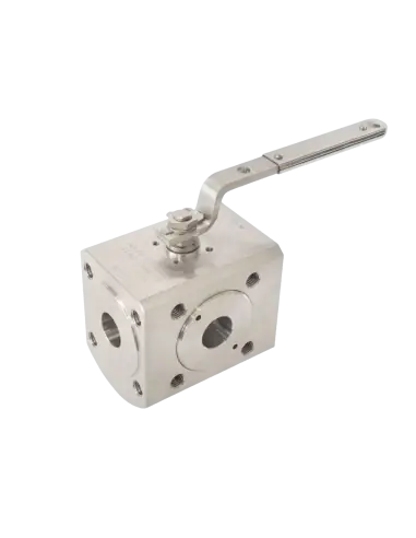 Four way 90° ball valve “wafer type”, manufactured from round bar, according to ASME B16.34; ISO 14313.