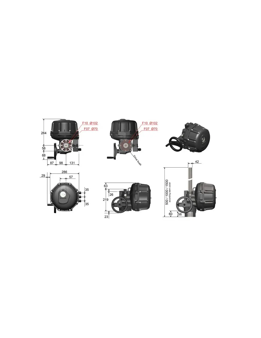 | Drive bush for threaded valve stem (Ø25mm max.) Connection with four M10 threaded holes (depth 20mm) or four M8 threaded holes (depth 15mm) | Drive bush for large keyed bore (Ø42mm & height 48mm max.) Connection with four M10 threaded holes (depth 20mm) or four M8 threaded holes (depth 15mm) | Small keyed bore (Ø20mm max.). Connection with four (0° or 45°for F10) M10 threaded holes (depth 20mm) or four M8 threaded holes (depth 15mm) | Shaft with tenons (Ø43mm). Connection with four (0° or 45° for F10) M10 threaded holes (depth 20mm) or four M8 threaded holes (depth 15mm) |